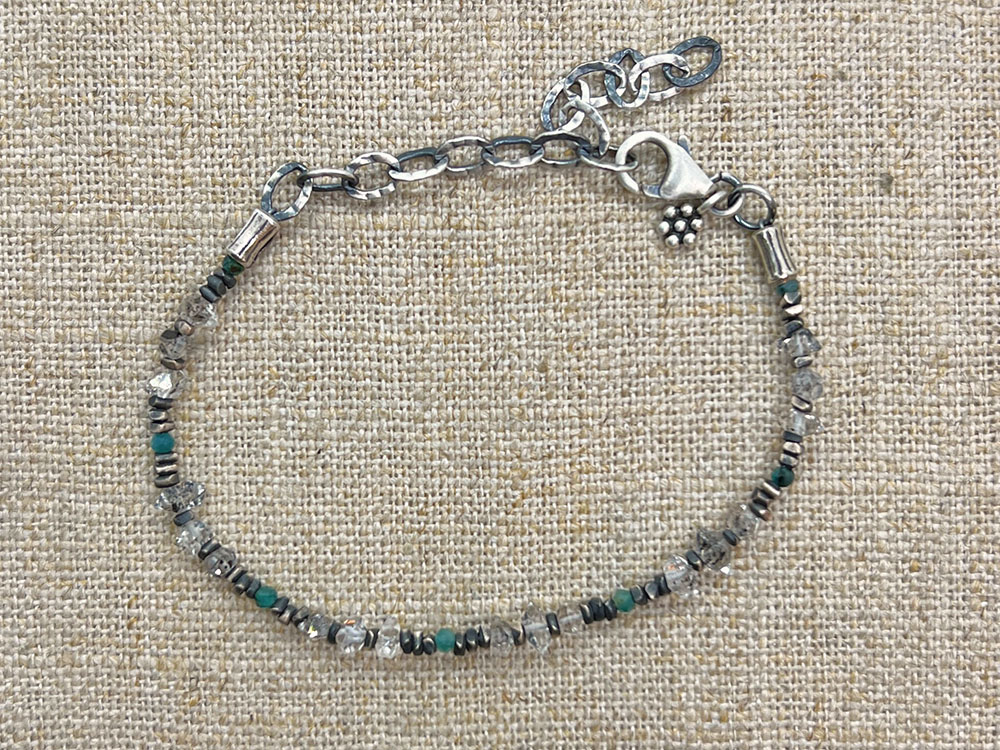 Diamond quartz, grandidierite, Thai silver, and sterling silver. Bracelet closes with a sterling silver lobster clasp and signature daisy charm.