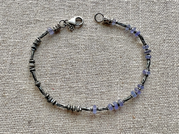 Tanzanite, Thai silver, & sterling silver. Sterling lobster clasp and signature daisy charm.