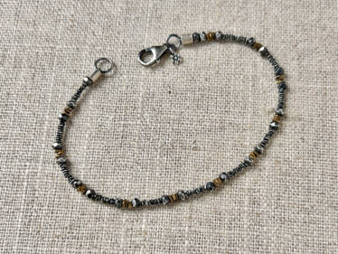Mixed metals are fantastic for fall. The Two-tone Mixed Metal Bracelet fits the bill perfectly. Delicate Thai silver and clusters of tiny brass beads dance along the length of the piece. Layer with any wrist stack or wear alone for an every day, delicate look.