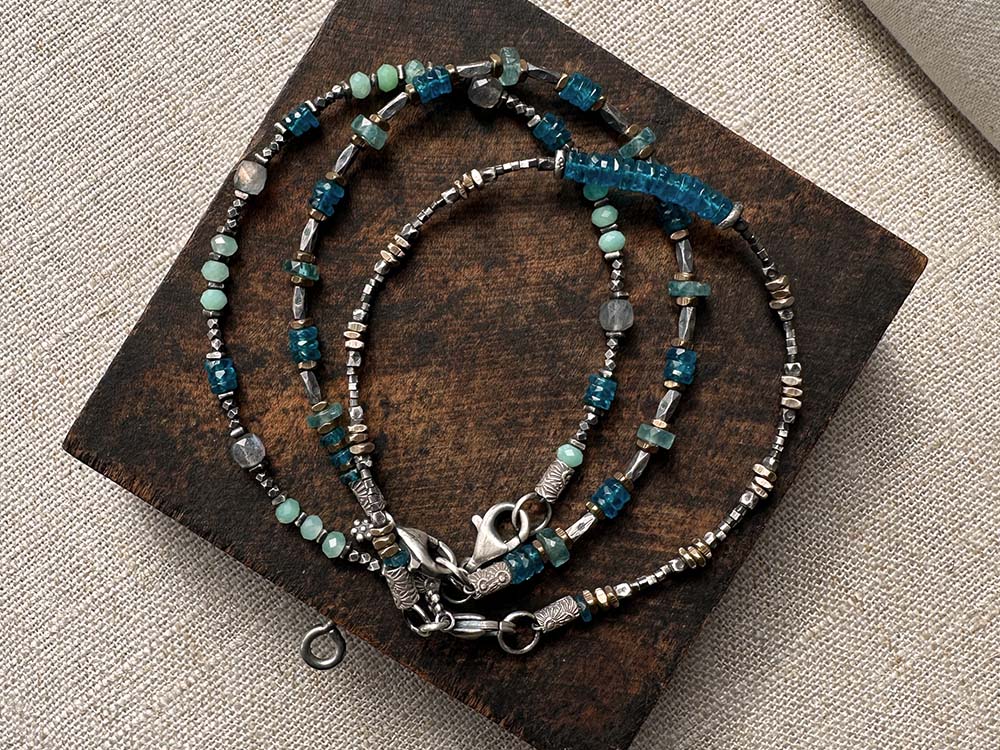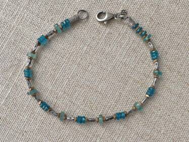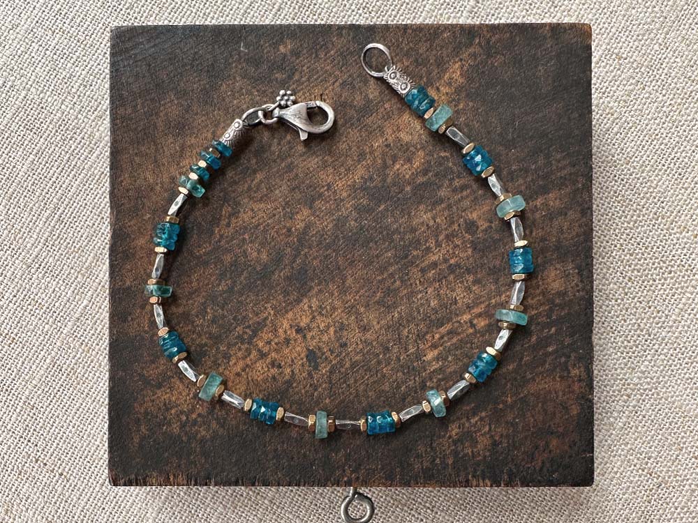 Shades of blue, sunny brass, give the Apatite, Brass & Thai Silver Bracelet a cheerful vibe. Apatite discs are sandwiched between brass and Thai silver. Rustically pretty and perfect for layering.
