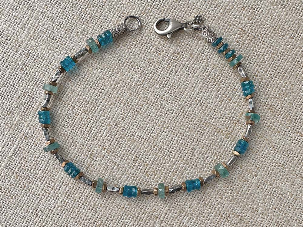 Apatite, brass, sterling & Thai silver. Bracelet closes with sterling lobster clasp and signature daisy charm.