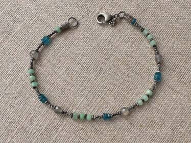 Spring green and deep blue give the Apatite & Chrysoprase Bracelet a fresh style. Blue apatite, chrysoprase, and labradorite, all mixed with Thai silver, for that rustic vibe you know and love. For matching earrings, check out the Apatite & Thai Silver Earrings.
