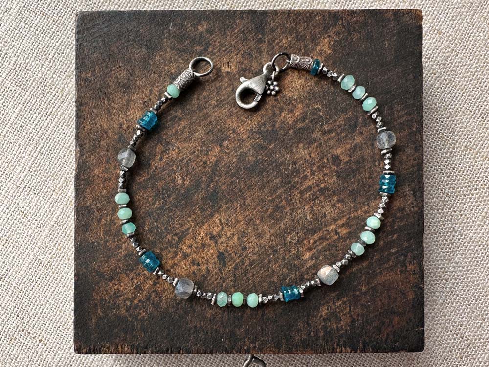 Apatite, chrysoprase, labradorite, sterling & Thai silver. Bracelet closes with sterling lobster clasp and signature daisy charm.