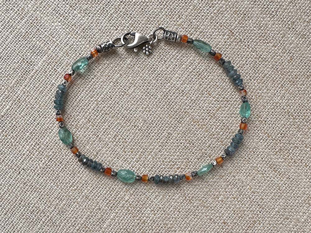 Apatite, kyanite, carnelian, sterling & Thai silver. Bracelet closes with an oxidized, sterling lobster clasp and signature daisy charm.