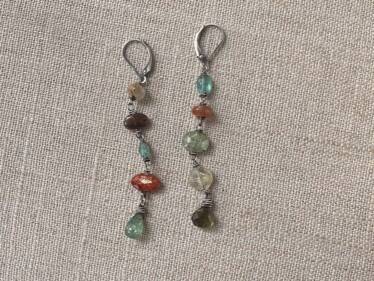 Richly hued gemstones make the Autumn Glow Sister Earrings a standout! Typical earrings are designed to be ‘twins’ – two identical earrings in the pair. ‘Sister Earrings’ are earrings designed to look like they belong together, but are actually not identical. These Sisters feature a host of gems – andalusite, kyanite, apatite, sunstone, and rutilated quartz – all chosen to enhance each other’s beauty. Oxidized sterling wire-wrapping adorns each stone. Longer in length to ensure each gemstone gets its chance to shine.