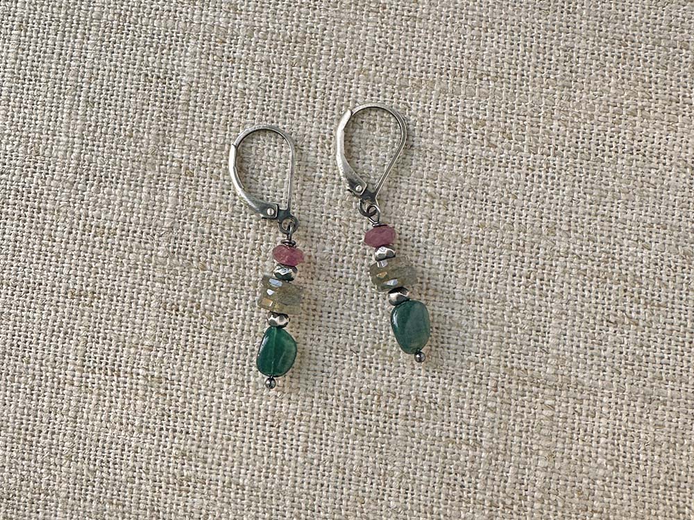 Pink tourmaline, labradorite, Ethiopian black opal, sterling & Thai silver. Earrings close with sterling leverbacks for a comfortable and secure fit.