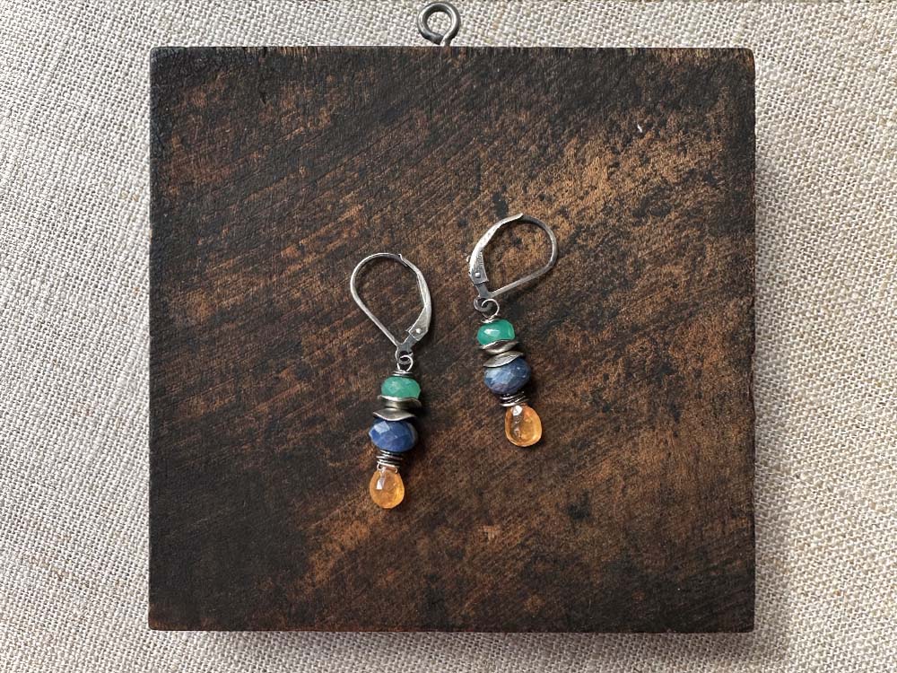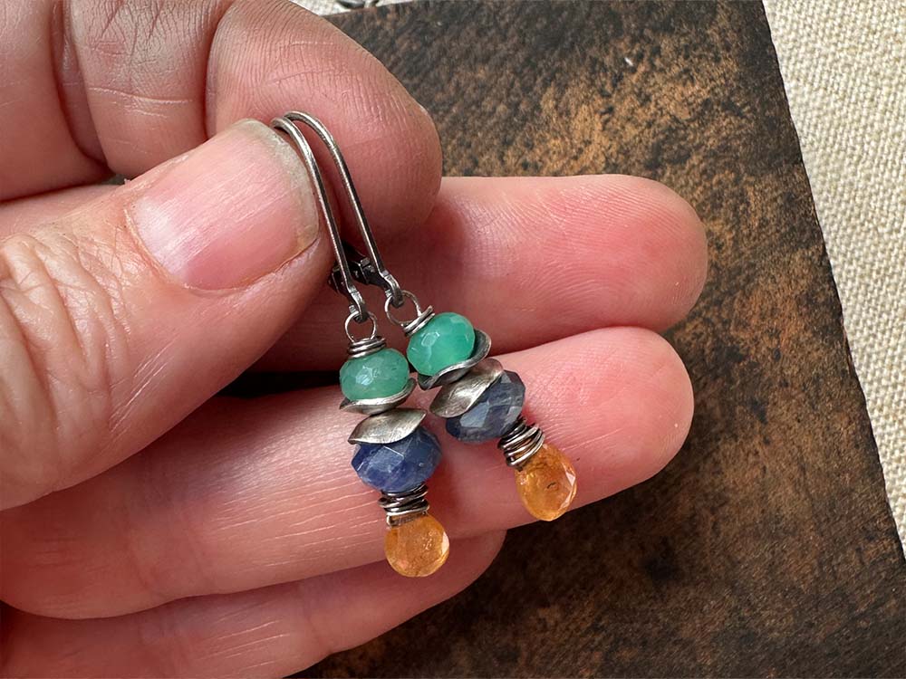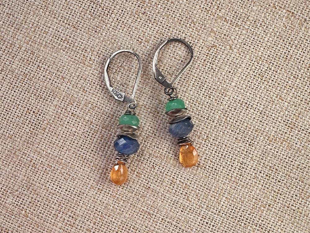 Mandarin garnet, kyanite, chrysoprase, sterling & Thai silver. Earrings close with sterling leverbacks for a comfortable and secure fit.