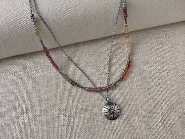 The Double-strand Tundra Sapphire Colorblock Necklace is fall inspired. A host of autumn hues punctuated by tiny Thai silver beads adorn one strand, while the other strand features a hand-stamped Thai silver pendant. The look of layering with little effort.