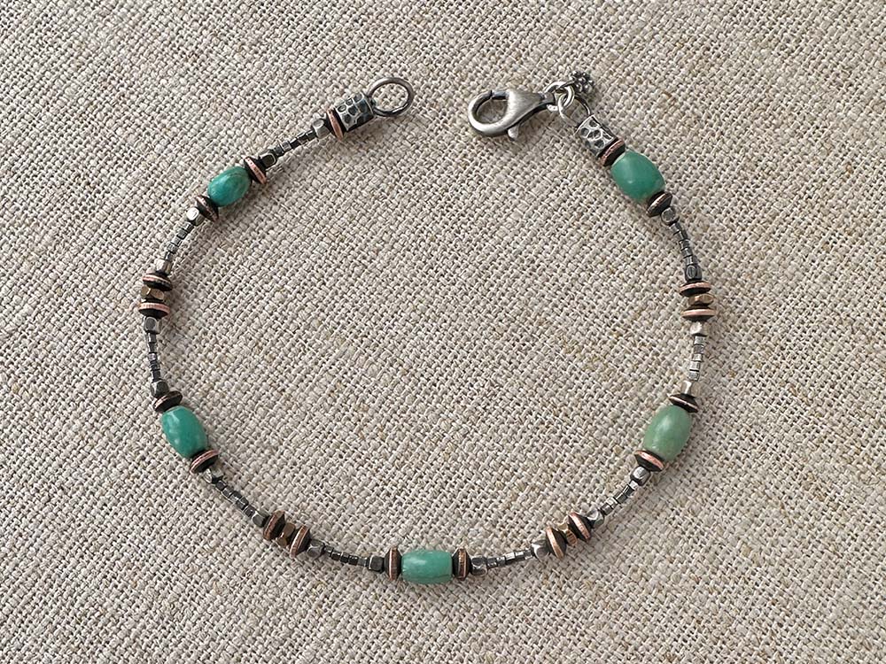 Elisa turquoise is a rare turquoise found in Sonora, Mexico. Known for its unique green tones and brown matrix, I find it’s perfect for spring. Here I’ve paired it with warm copper and Thai silver beads. Gorgeous on it’s own, but twice as nice paired with a friend, such as the Mixed Metal Saucer Bracelet.