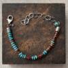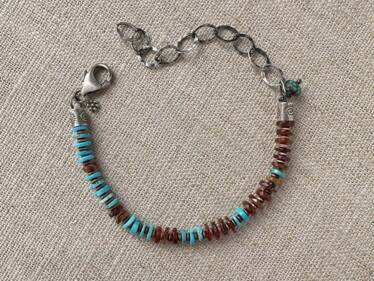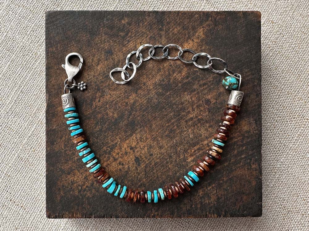 Hessonite garnet, Kingman turquoise, copper-plated brass, sterling & Thai silver. Bracelet closes with sterling lobster clasp and signature daisy charm.