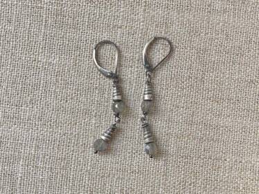 Labradorite is the perfect neutral. It appears grey, but reflects light, allowing flashes of color while you wear it. In the Labradorite Double Cone Earrings, you get a longer earring with 2x the labradorite for maximum flash. Thai silver cones give these earrings a rustic-geometric feel.