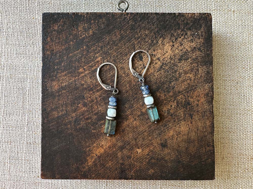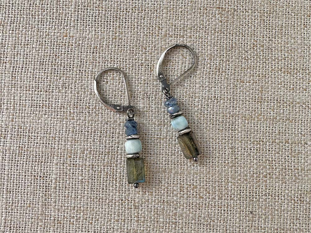 Labradorite, larimar, kyanite, sterling & Thai silver. Earrings close with sterling leverbacks for a comfortable and secure fit.