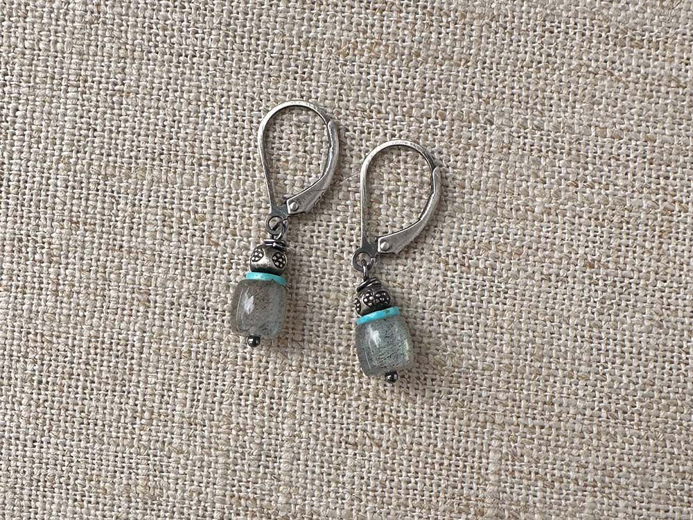 Labradorite, turquoise, sterling & Thai silver. Earrings close with sterling leverbacks for a comfortable and secure fit.