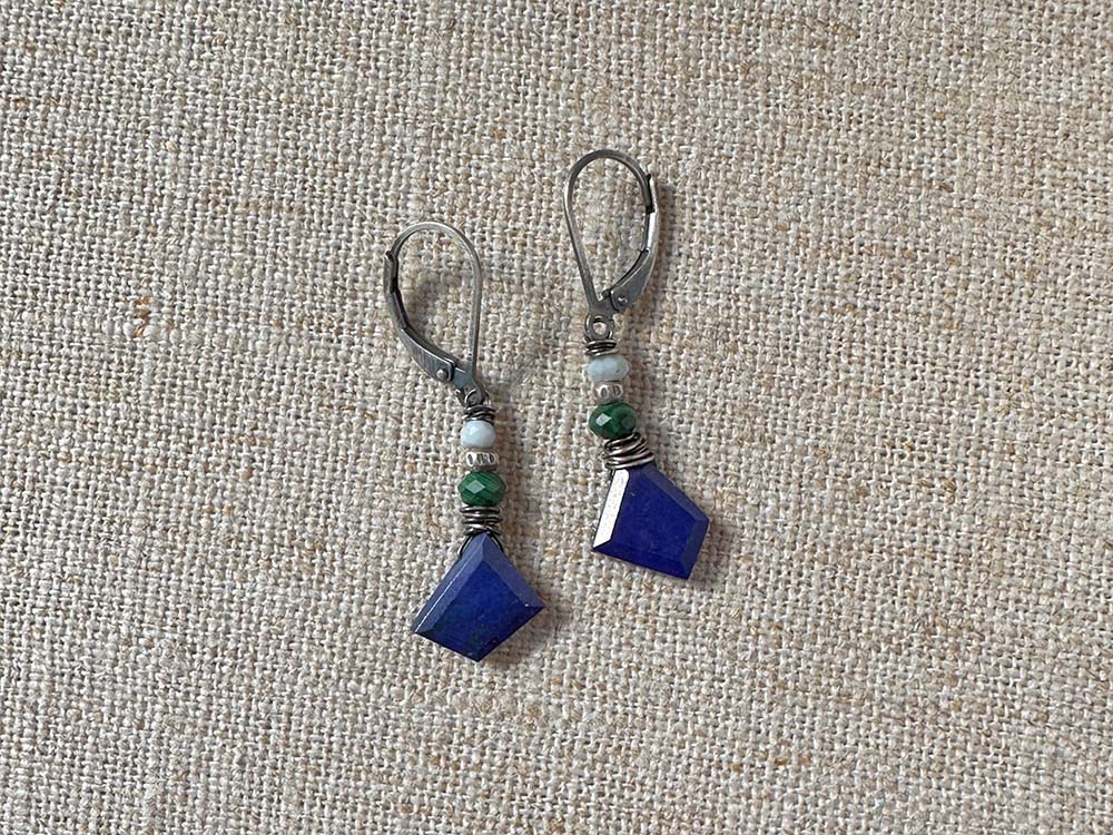 Soothing vibes only. The Lapis Four Corners Earrings offer fresh shades of blue and green. Lapis stones, wire-wrapped and stacked with Thai silver, blue opal, and malachite.