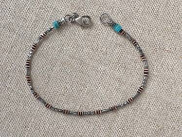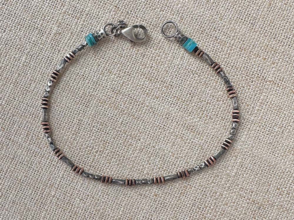 Textural Thai silver and warm copper beads make the Mixed Metal & Kingman Accent Bracelet a go-to for spring. Slices of Kingman turquoise bookend a long line of Thai silver and copper, oxidized and made to go with everything.