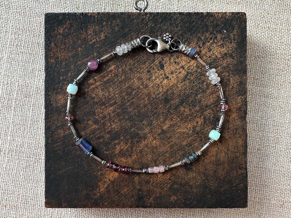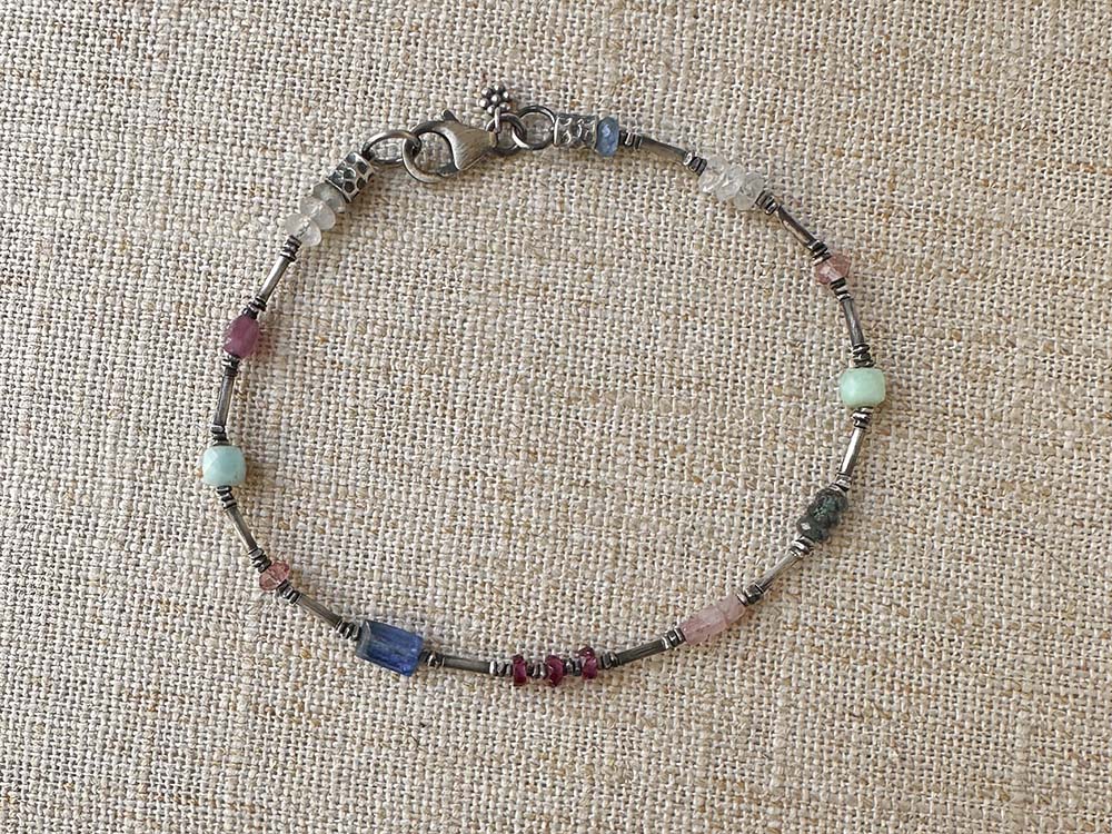 Kyanite, star ruby, rainbow moonstone, larimar, rose quartz, sterling & Thai silver. Bracelet closes with sterling lobster clasp and signature daisy charm.