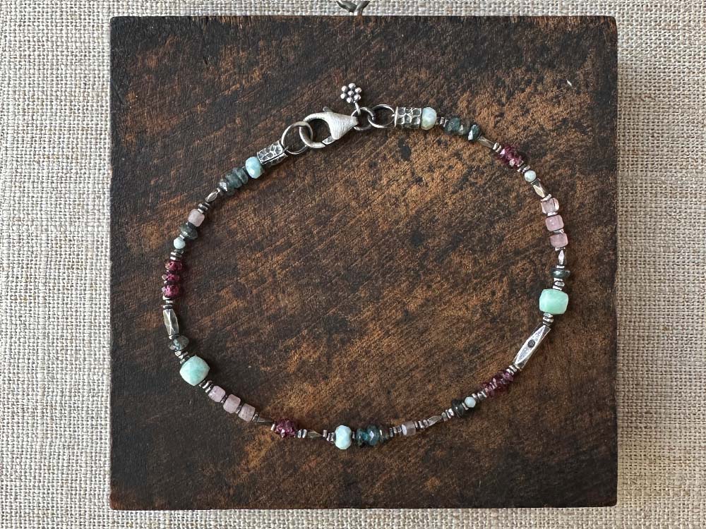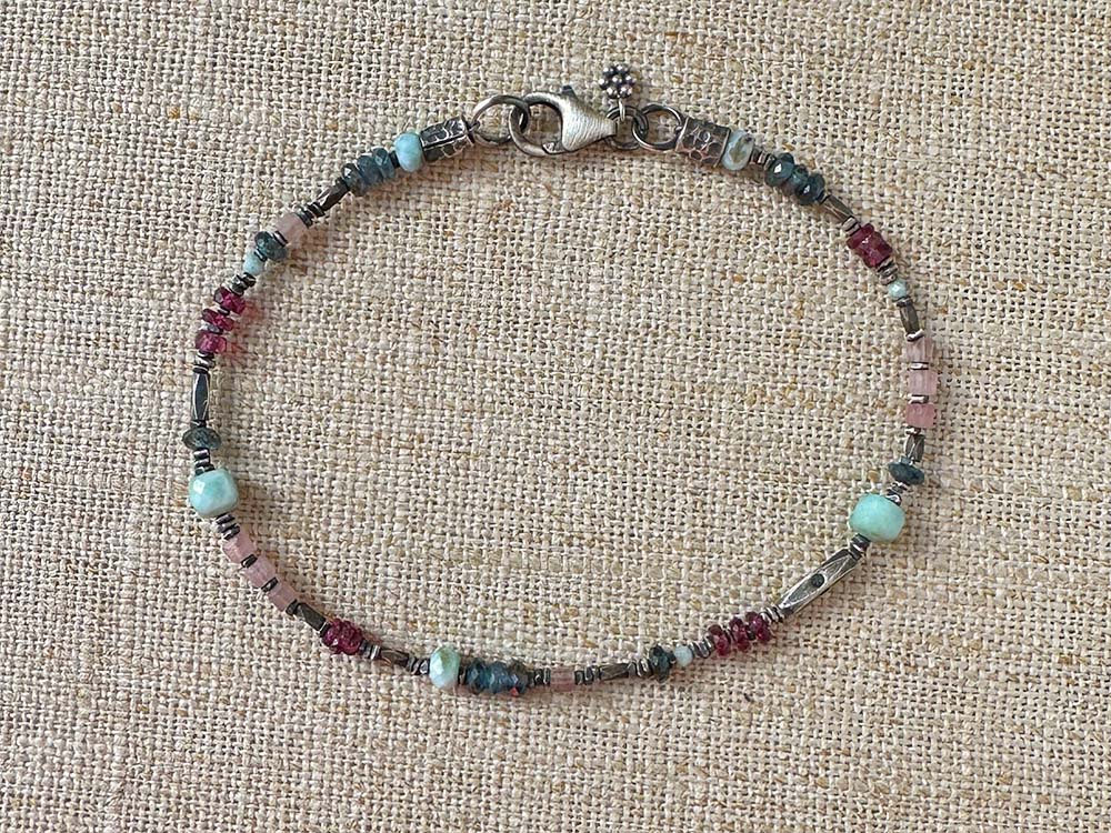 Larimar, purple garnet, kyanite, Madagascar rose quartz, sterling & Thai silver. Bracelet closes with sterling lobster clasp and signature daisy charm.