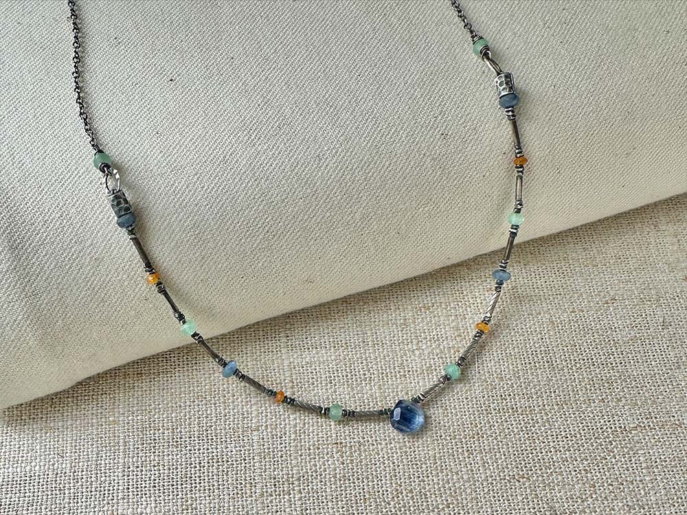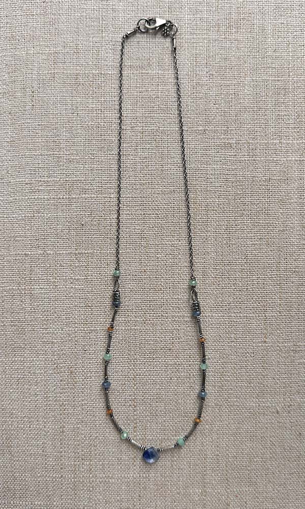 Kyanite, chrysoprase, carnelian, sterling & Thai silver. Necklace closes with a sterling lobster clasp and signature daisy charm.