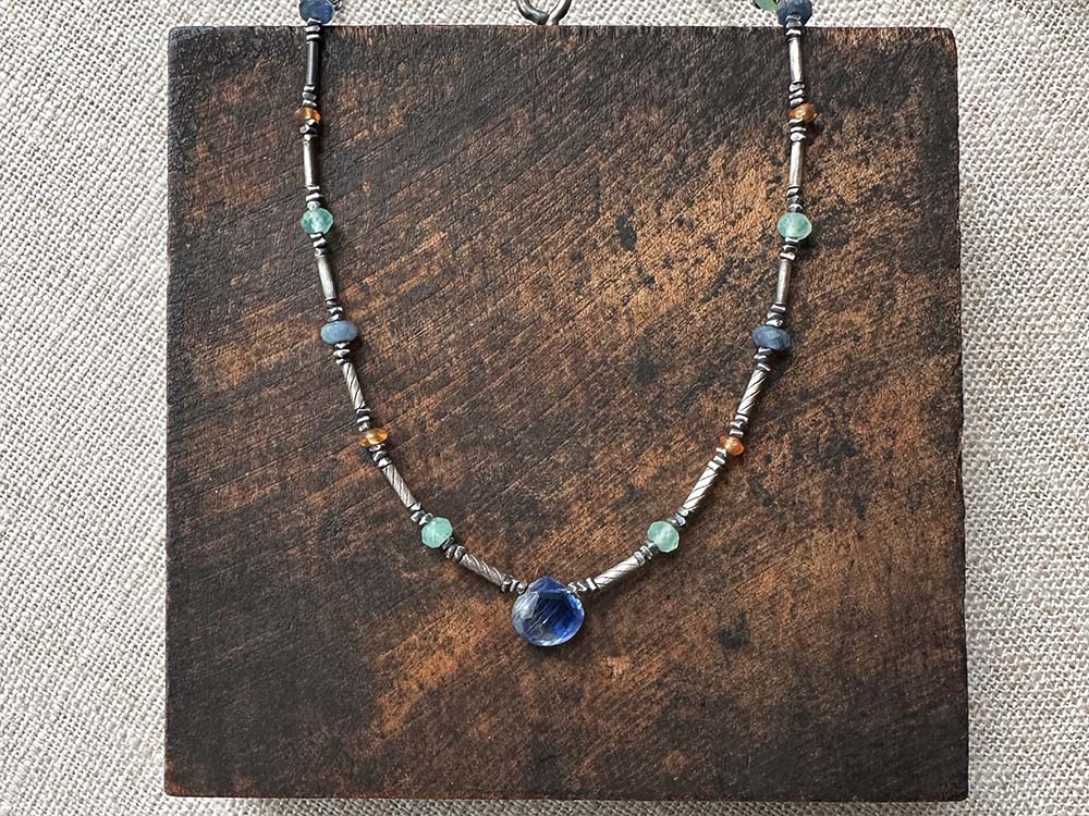 Delicate and pretty and touched by spring. The Slender Kyanite Necklace features a blue kyanite, surrounded by rustic Thai silver, hints of chrysoprase, and carnelian. Wear by itself or layer for a look all your own.