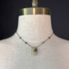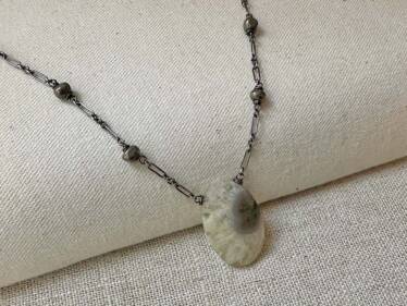 The Solar Quartz Pendant Necklace is truly one-of-a-kind. Solar quartz is agatized quartz, sliced from stalactites that form over centuries. This necklace features a large solar quartz, polished and faceted to show off its ‘eye’. Wire-wrapped with polished nuggets of pyrite and oxidized sterling chain.