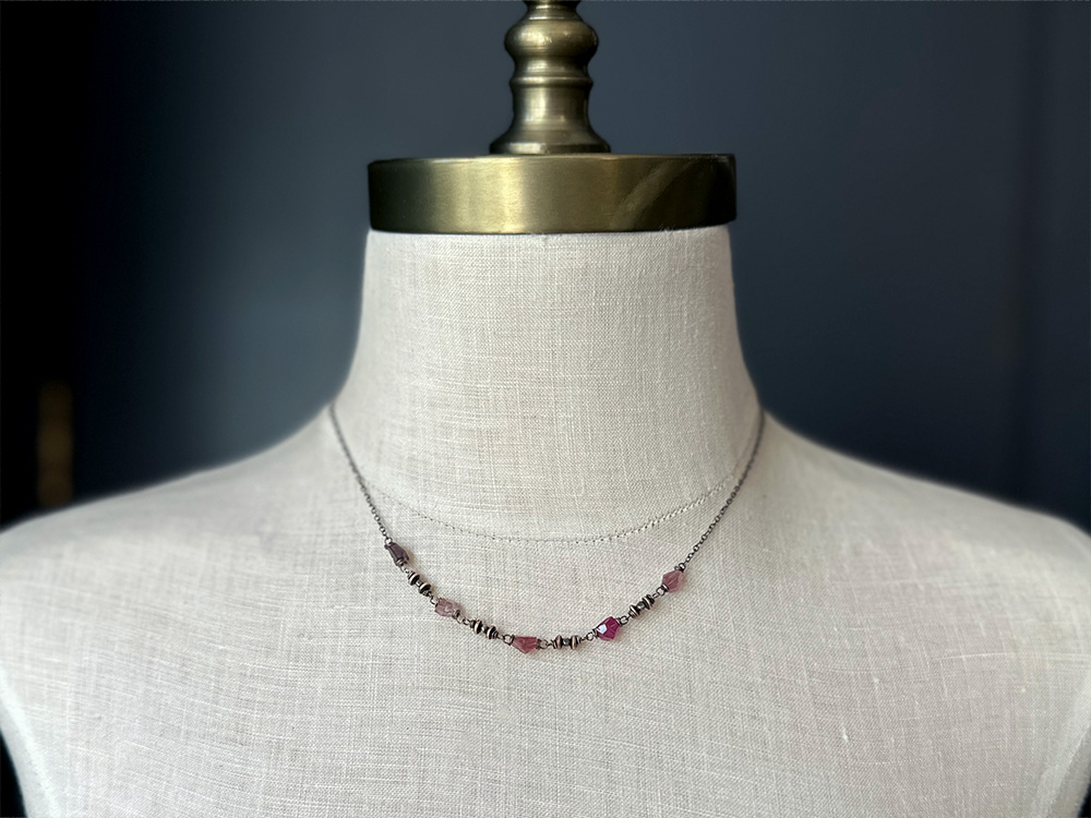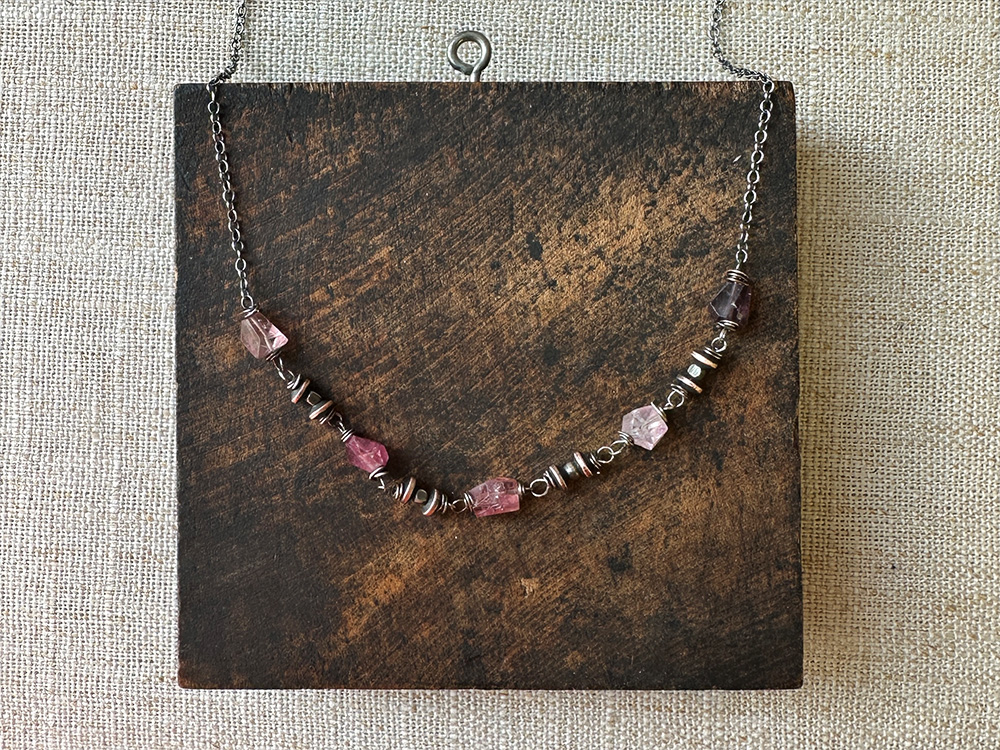 The Spinel & Copper Saucer Necklace features shades of pink and mauve to rival any spring sunset. Five spinel nuggets, delicately wire-wrapped in sterling silver, accented by copper and sterling beads, and suspended between lengths of oxidized sterling chain. Absolutely stunning.