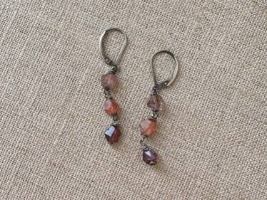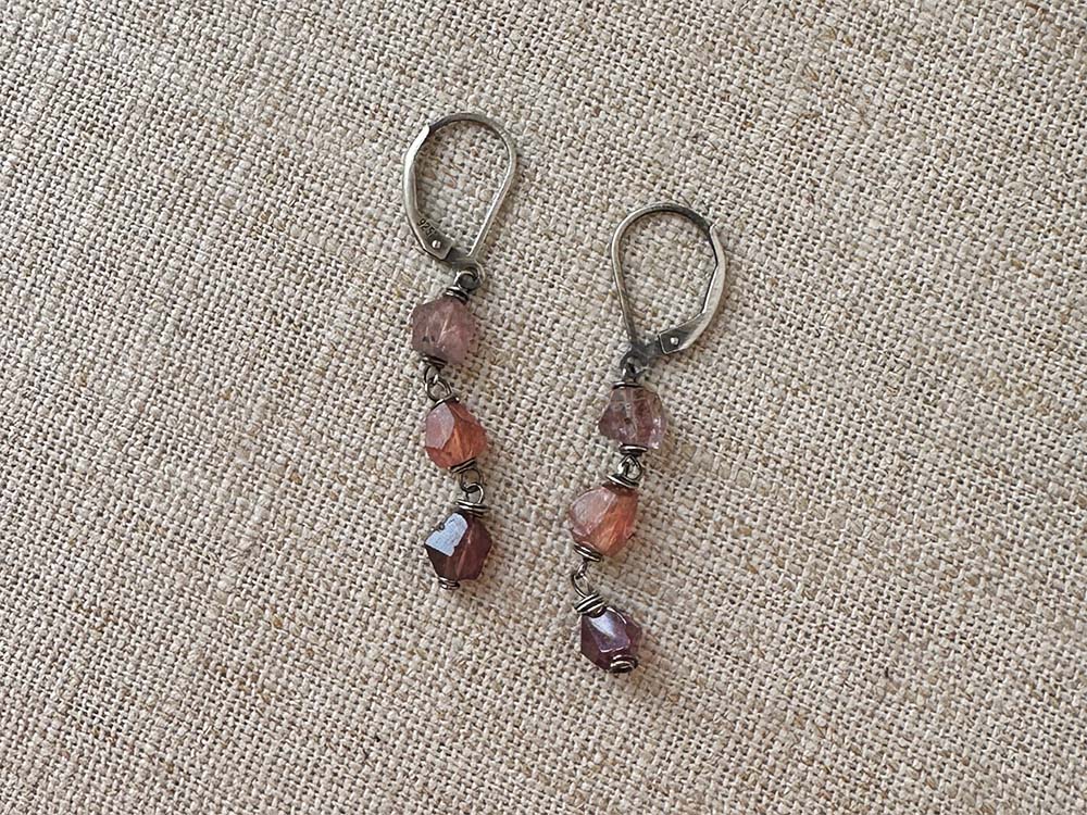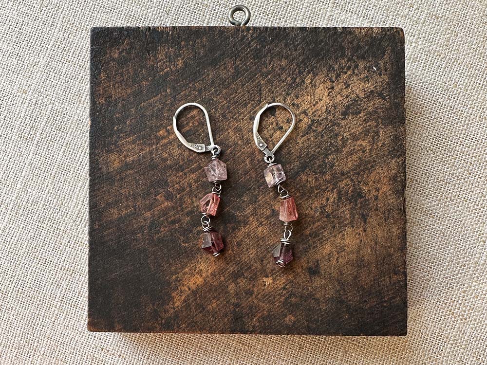 Rustically pretty, the Spinel Three Stone Earrings mean business. Shades of spinel, ranging from deep lavender to rosé, linked with sterling wire-wrapping. Oxidized silver gives antique vibes while giving earthy undertones. Love these with the Spinel & Copper Saucer Necklace.