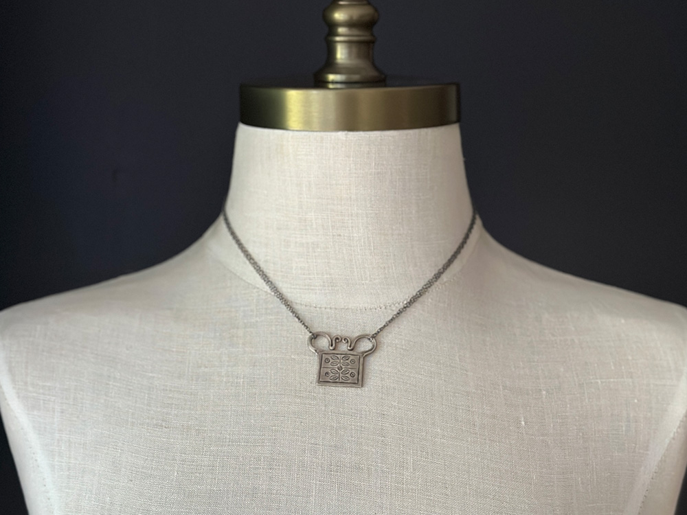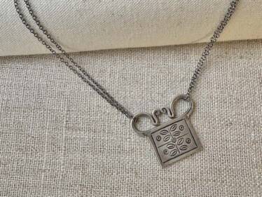 A Spirit Lock Pendant is a traditional northern Thai ornament believed to have the power to preserve or restore the physical or mental energy to the body/mind. This pendant is suspended from a double sterling chain, oxidized with a hand-polished patina. Kingman turquoise accents at clasp.