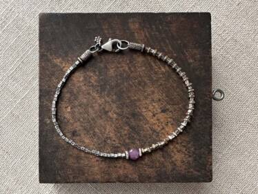 What’s more dreamy than pink, the color of frozen raspberries? The Star Ruby Solitaire Bracelet features a faceted, coin-shaped star ruby such as this. Rich, raspberry pink contrasted by stamped Thai silver and warm brass beads. Delicate, pretty, and unforgettable.