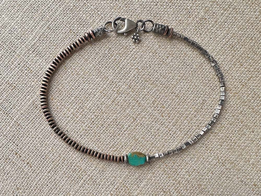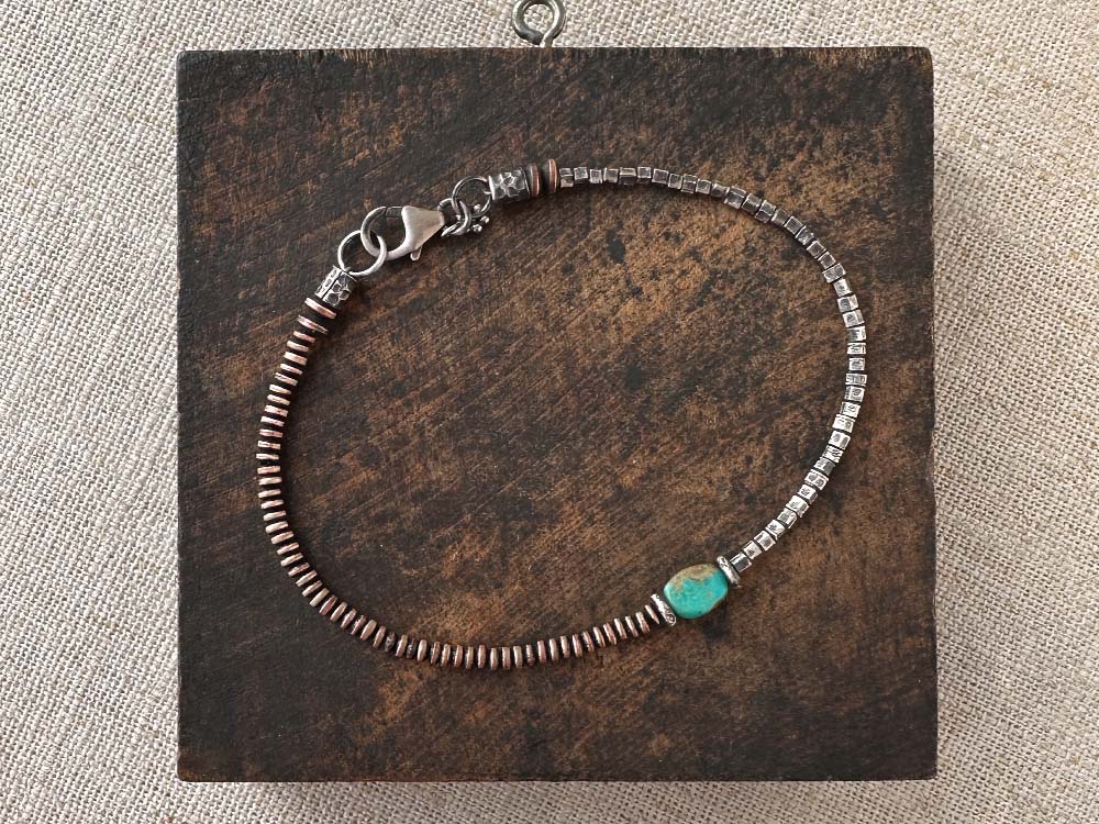 The best of both worlds! Thai silver, stamped beads, and copper-plated brass share the stage with a small turquoise stone. Rustic and fun, and great for layering. We suggest the Kingman Three by Three Bracelet and the Mixed Metal & Kingman Bracelet.