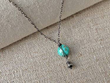Perfect for a pop of color, the Turquoise Wire-Wrapped Coin Pendant has you covered. Delicate wire-wrapping ensnares a faceted Sleeping Beauty turquoise coin. Oxidized sterling silver chain and Thai silver drop adds a rustic touch.