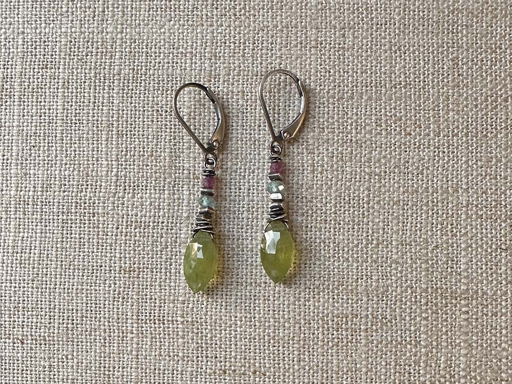 Vesuvianite, apatite, ruby, sterling & Thai silver. Earrings close with sterling leverbacks for a comfortable and secure fit.