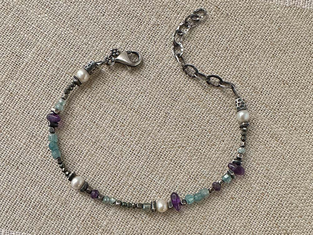 Blue zircon, pearl, amethyst, pyrite, sterling & Thai silver. Bracelet closes with sterling lobster clasp and signature daisy charm.