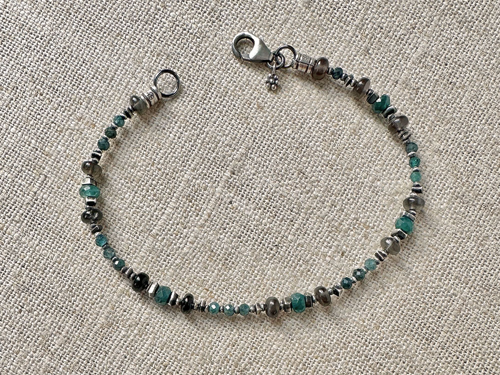 Grey moonstone adds sultry tones to the Smoky Grandididerite Bracelet. Soft teal green grandidierite and luminescent grey moonstone studded with oxidized Thai silver beads. Rustic and ready for the deeper tones of fall and winter.