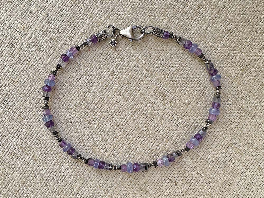 Amethyst, iolite, tanzanite, sterling & Thai silver. Bracelet closes with a lobster clasp and signature daisy charm.