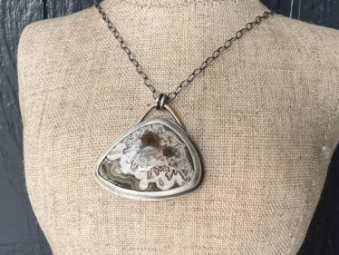 Our Stardust Crazy Lace Agate Pendant is a little piece of heaven wrapped in sterling silver. Hand-crafted with a one-of-a-kind Stardust Crazy Lace agate stone, bezel set in sterling silver with a hand-made bail formed in bronze. The beautiful pendant swings from an oxidized sterling silver chain. My signature daisy stamp is found on the backplate.