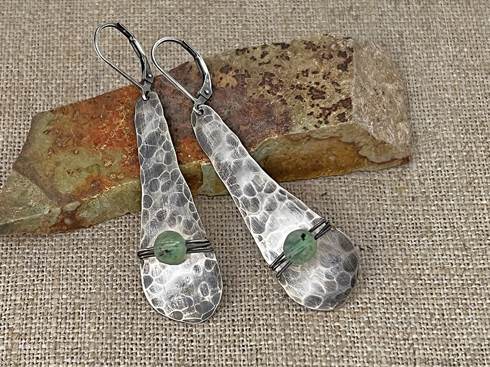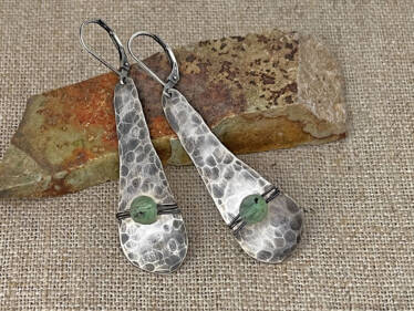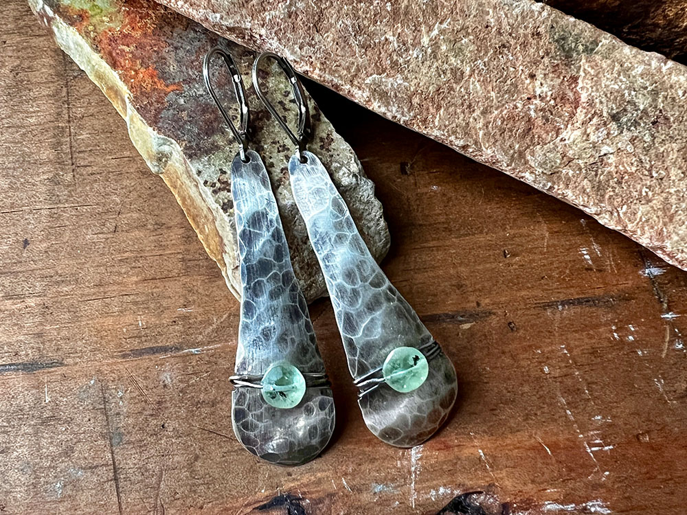 These Arroyo Earrings are handcrafted in sterling silver and cut, hammered, oxidized & polished to a rustic finish. A faceted green kyanite stone peeks between layers of sterling silver wire-wrapping.