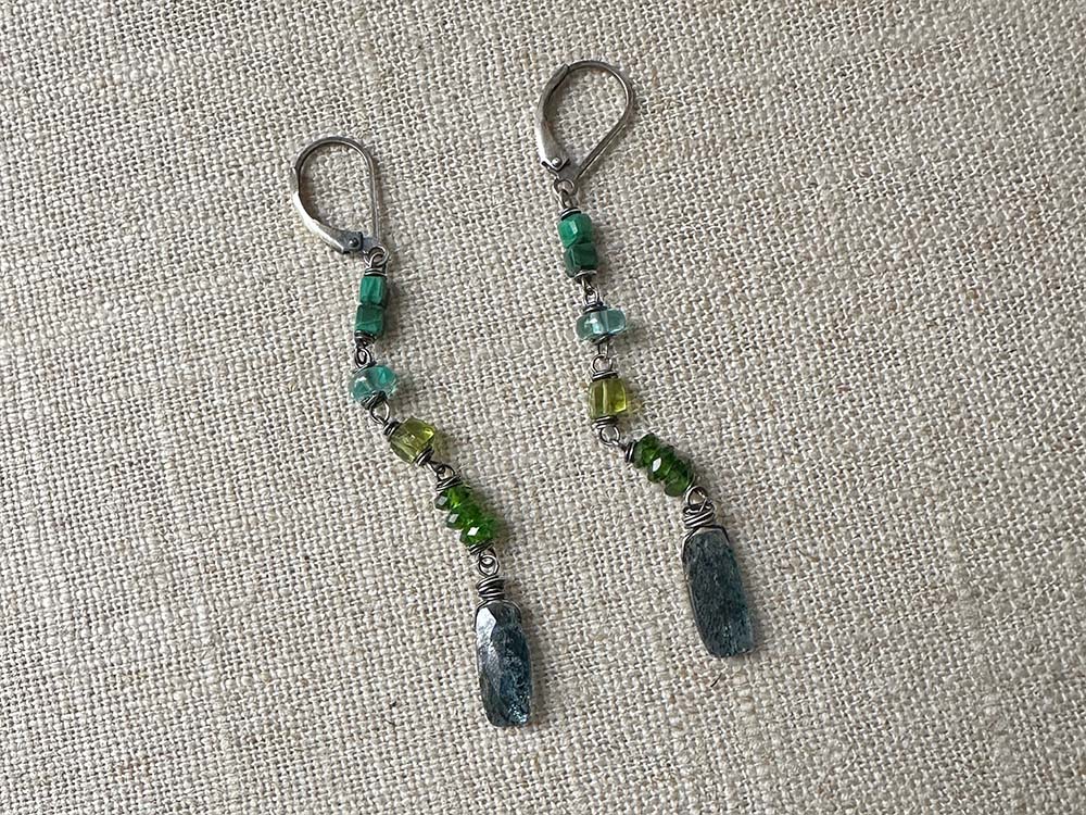 Malachite, apatite, peridot, chromium diopside, blue kyanite, & sterling silver. Earrings close with sterling leverbacks for a comfortable and secure fit.