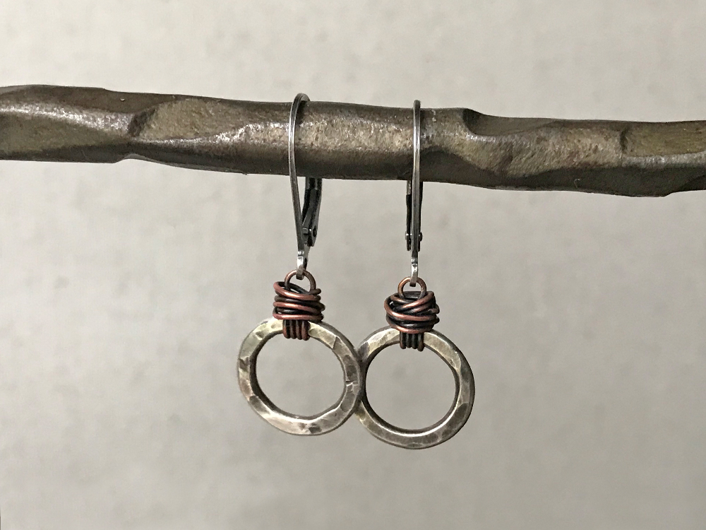 While our Silver & Copper Dreamcatcher Earrings may not keep nightmares away, they will certainly add some fun to your wardrobe. Small hammered circles, made by me, are carefully wrapped in copper wire. Earrings measure 1/2 inch long, and swing from sterling silver leverbacks.