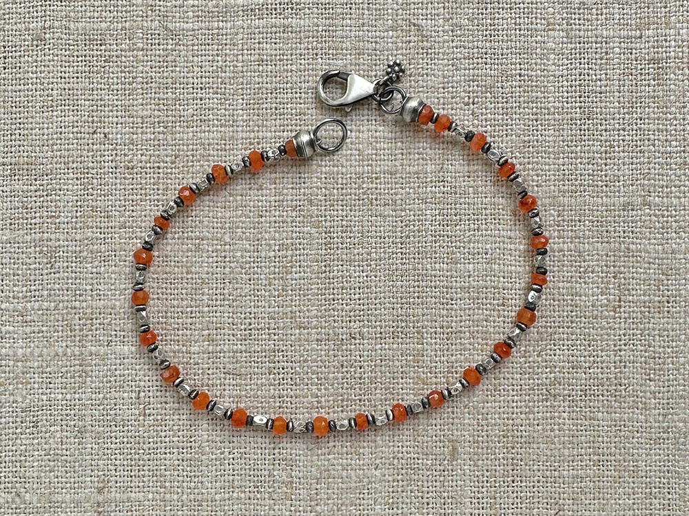 Ancient Egyptians referred to carnelian as the “Sunset Stone” for their belief that it caught the heat of the sun and channeled it to its wearer. I’m not sure if the Carnelian & Thai Silver Bracelet will keep you warm, but it will definitely remind you of sweet summer days and warm fall afternoons. Faceted carnelian gems alternate with tiny Thai silver beads. Perfect for layering with the Color Me A Rainbow Bracelet.