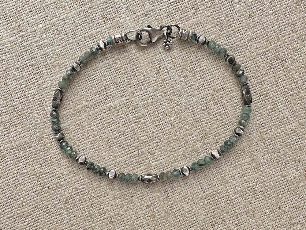 Shimmering silver-green kyanite gives life to the earthy Green Kyanite & Thai Silver Bracelet. Faceted mossy green stones accented by oxidized Thai silver beads. Layer with the Glimpse of Gold Sapphire Bracelet for a tonal stack.