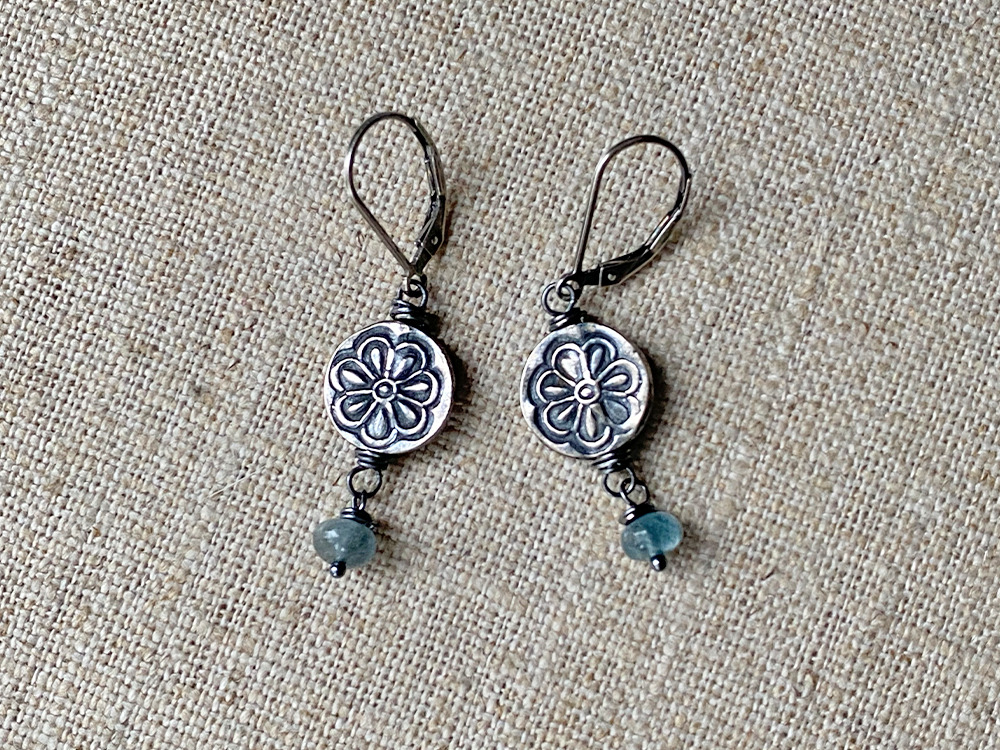 fThe Moss Aquamarine Floral Earrings are a perfect everyday piece with a hint of color. Rustic flower stamped Thai silver beads are the focal points of these earrings. A single drop of icy blue moss aquamarine swings delicately from below. Sterling silver wire nests also accent both the Thai silver and moss aquamarine stones. The earrings measure 1 inch in length and close with sterling silver leverbacks for a secure fit.