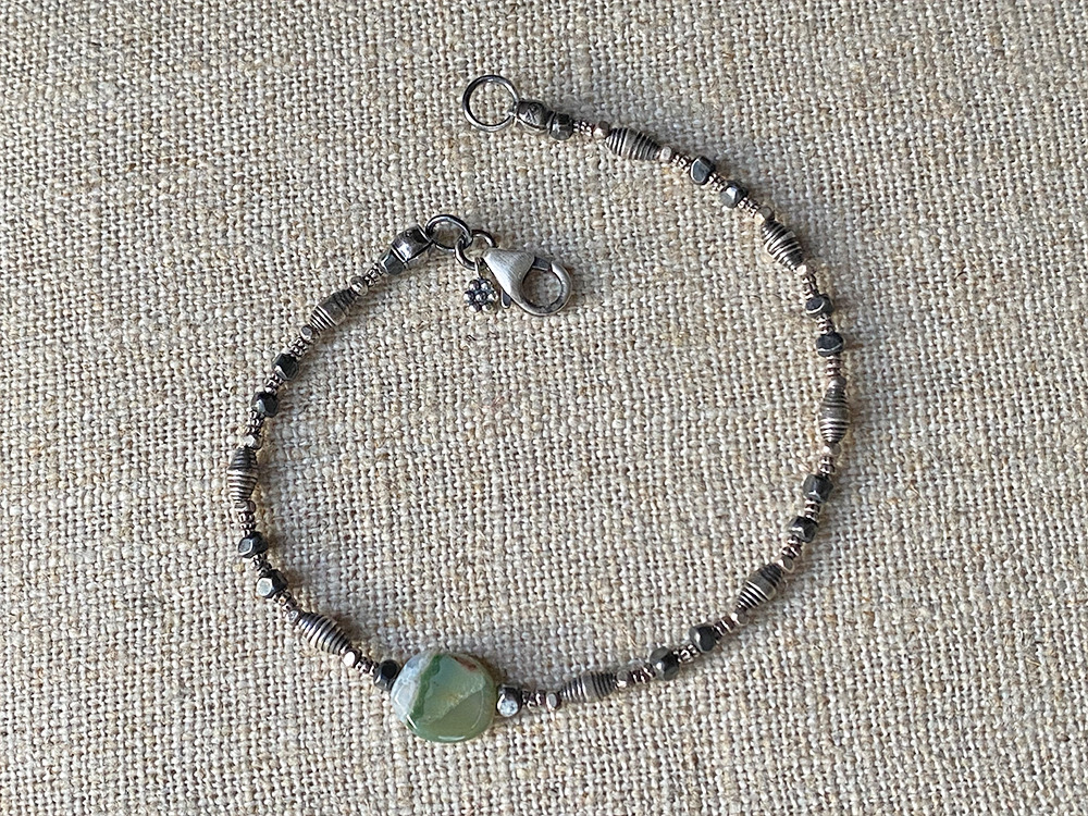 The dainty Ocean Jasper & Thai Silver Bracelet is a lovely piece to warm up your winter attire. A strand of rustic, mixed Thai silver beads supplies the backdrop for a single polished ocean jasper stone in shades of green and cream. The bracelet measures 7.5 inches long and closes with a sterling silver lobster clasp and signature daisy charm.