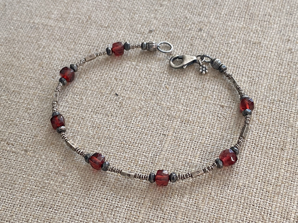 Ruby red is the featured, stunning color in the Red Garnet Cube Bracelet. Faceted red garnet cubes meander along a strand of tiny Thai silver beads. Wear alone or with your favorite stack. This piece measures 7.5 inches long and closes with a sterling silver lobster clasp and signature daisy charm.