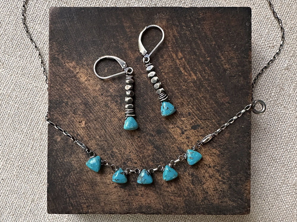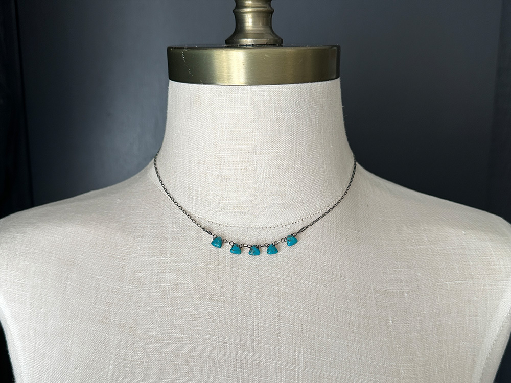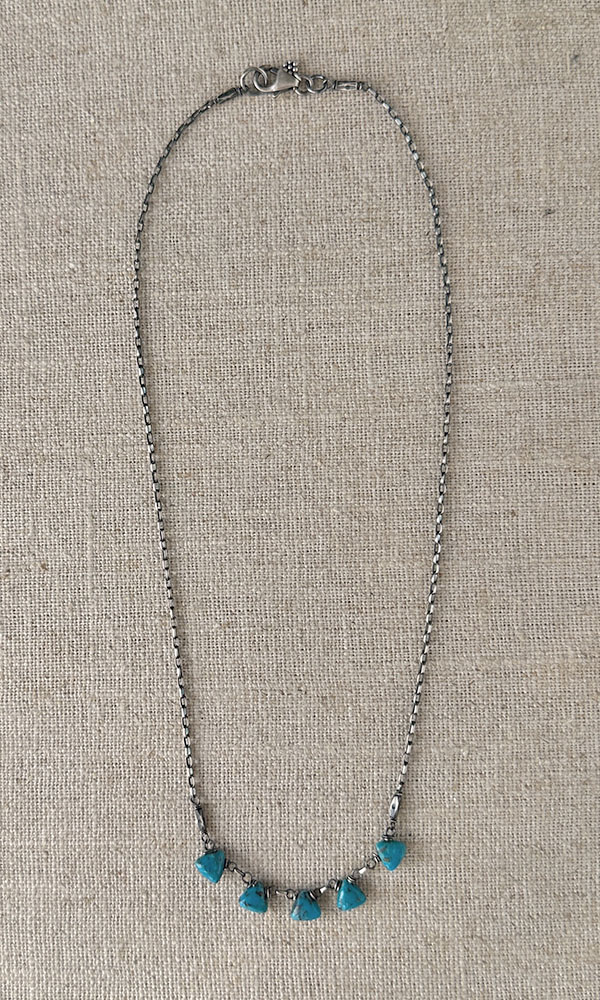 The Turquoise Five of a Kind Necklace is made for layering. Five triangle-shaped turquoise are the centerpiece in this versatile necklace. Oxidized sterling chain, and Thai silver accents give the perfect carefree, boho vibe.