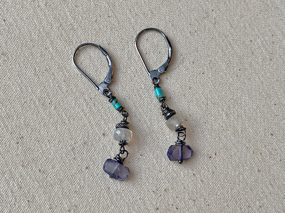 The Turquoise, Moonstone & Iolite Earrings are playful with a beautiful array of colors. Kingman turquoise cascades down to rainbow moonstone, then to a dusky purple iolite. Each stone has its own unique shape and texture. Stamped Thai silver and wire wrapping also add a rustic accent to the pair. Earrings measure 1.5 inches long and close with sterling silver leverbacks.