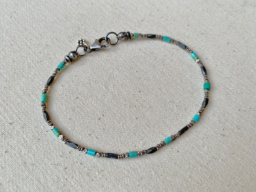 The Turquoise & Thai Silver Bracelet is a simple yet eye-catching piece. As the newest addition to the Essentials Collection, this bracelet takes versatility to a new level. While different shades and textures of Thai silver dance along this delicate strand, tiny Kingman turquoise beads add a fun pop of color. Delicate and timeless worn alone, not to mention the perfect addition to any wrist stack. Bracelet measures 7.5 inches long and closes with a sterling silver lobster clasp and signature daisy charm.