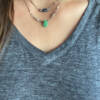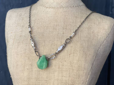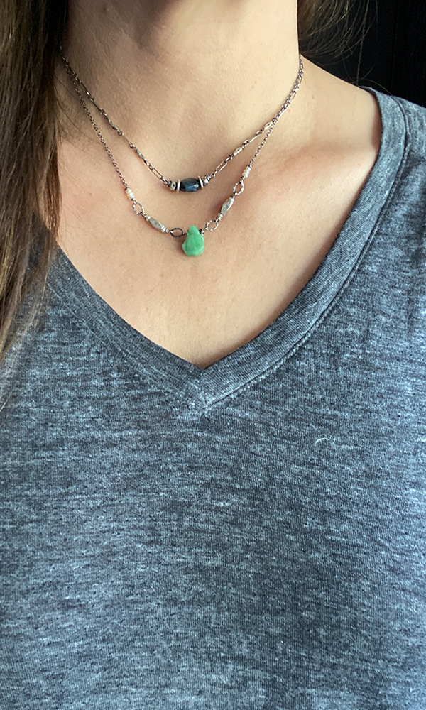 An eye-catching chrysoprase stone so luminous it almost looks like candy, is the centerpiece of the Wire-Wrapped Chrysoprase Necklace. Stamped Thai silver beads and tiny fresh water pearls serve to enhance this juicy drop of chrysoprase while still giving it center stage. Delicate oxidized sterling chain and lobster clasp finish the piece. Necklace measures 16 inches long.