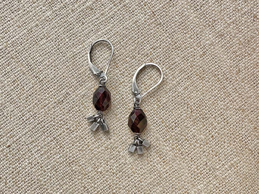 Garnet, not only the birthstone for January, but the hero of the Garnet & Sterling Fringe Earrings. Rich red, faceted garnets wrapped in sterling wire and suspending trios of tiny sterling charms.