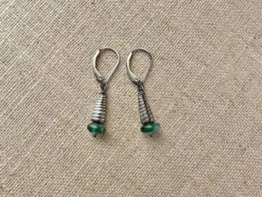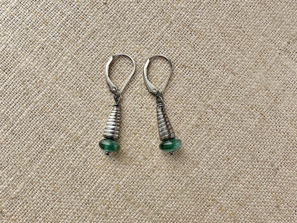 The Green Apatite Cone Earrings highlight some of my favorite apatite stones. The deep green-blue color is so rich and dreamy. Accented with a set of interesting Thai silver beads and you have a distinctive pair of earrings that will give you loads of styling opportunities.