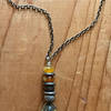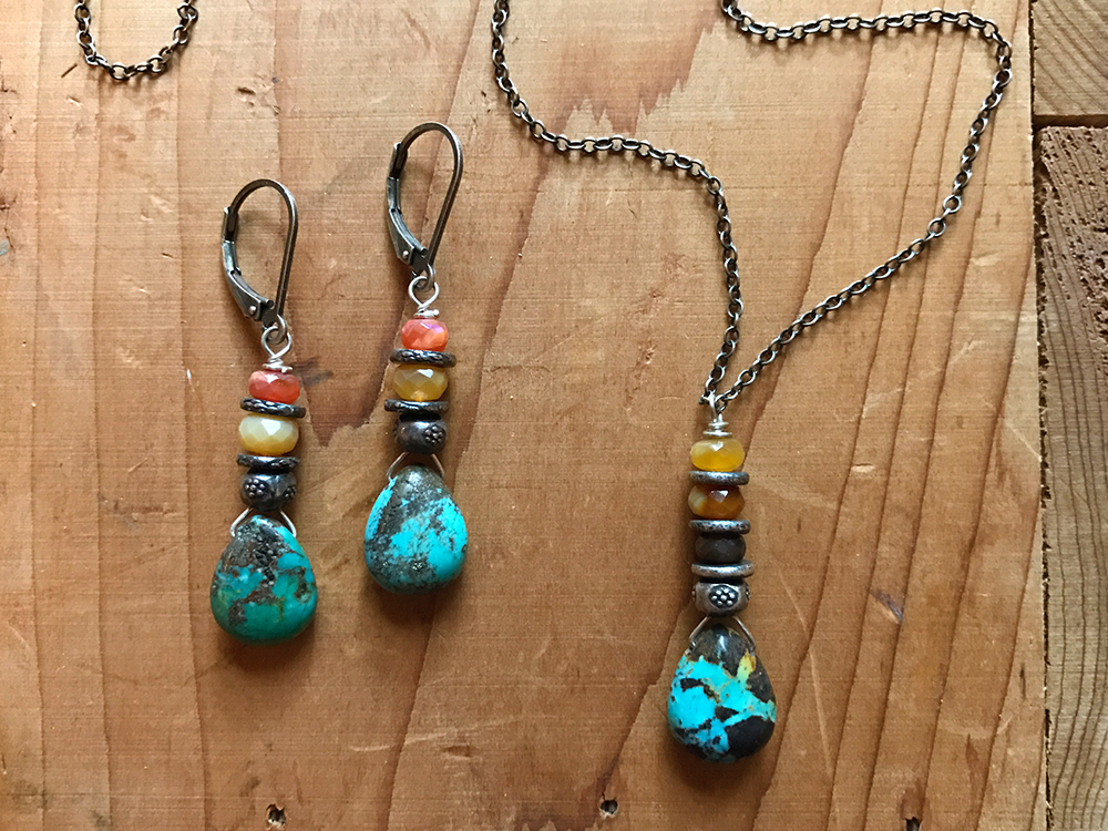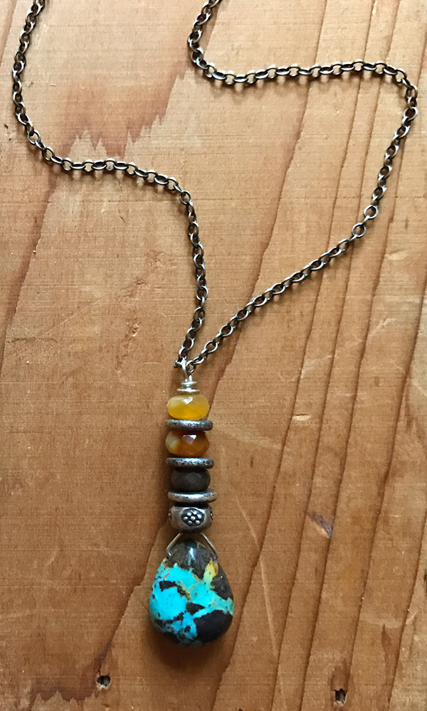 The Desert Dream Necklace is a study of sky and earth. A polished blue turquoise drop with distinctive brown and black veins, sits below a stack of Thai silver and Mexican fire opal. The pendant swings from a hand-polished, oxidized chain measuring 20″ long. Silver accents at the back of the neck. Sterling silver lobster clasp and signature daisy charm to close. Pairs perfectly with the Desert Dream Earrings.
